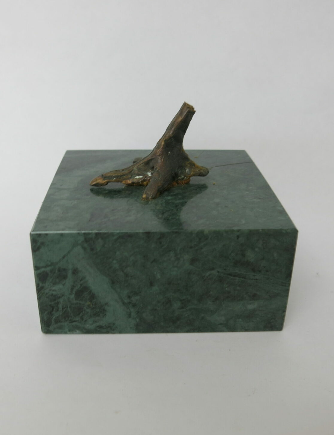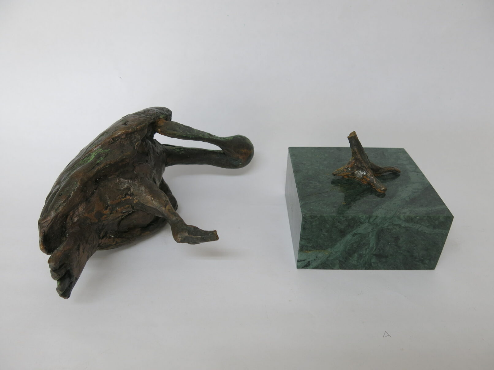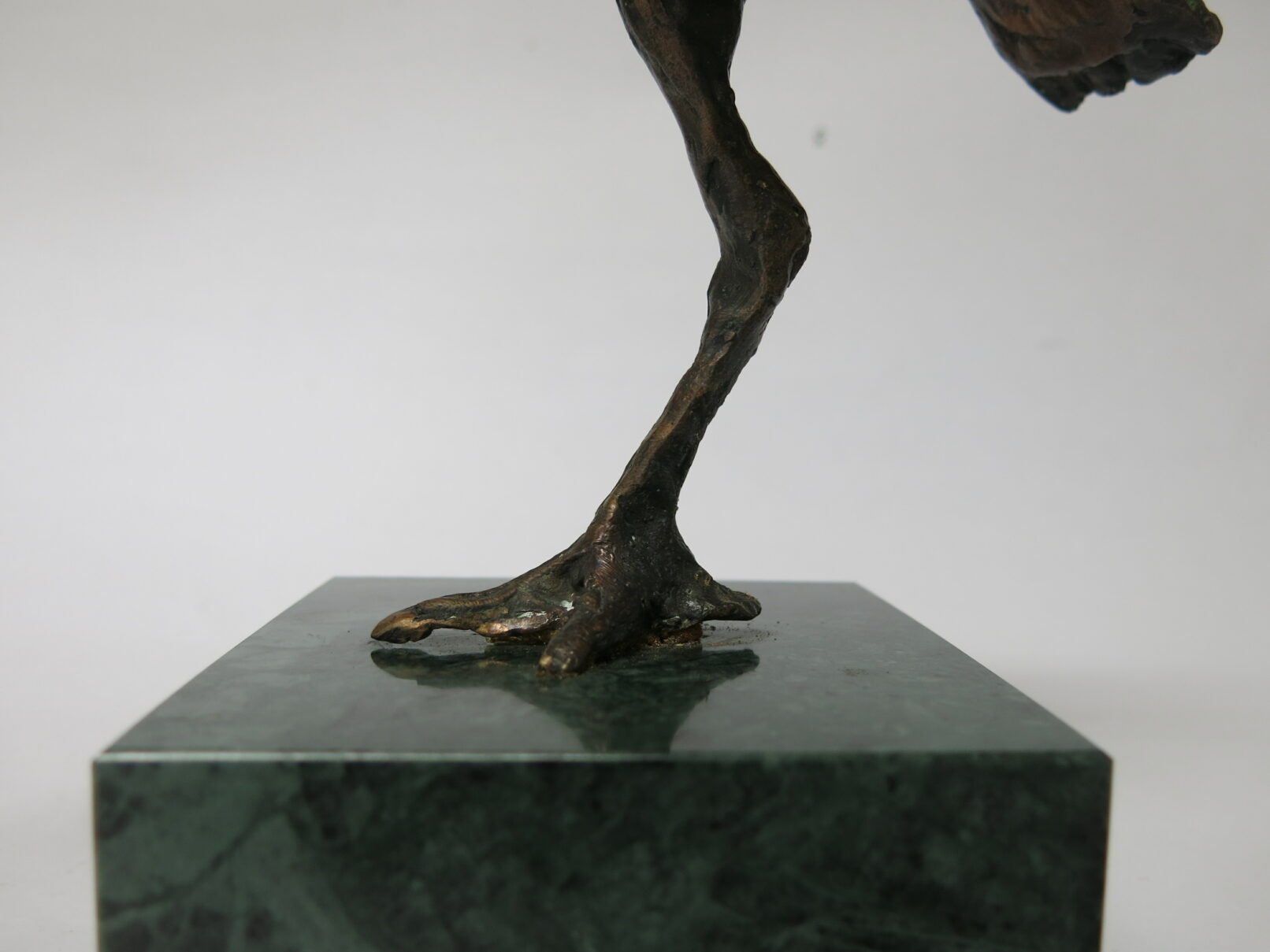 Dit sculptuur van een lepelaar was gebroken bij het pootje van de vogel. Het is een klein sculptuur van circa 30 centimeter hoog dat is gegoten in brons en geplaatst op een vierkante, marmeren voet.